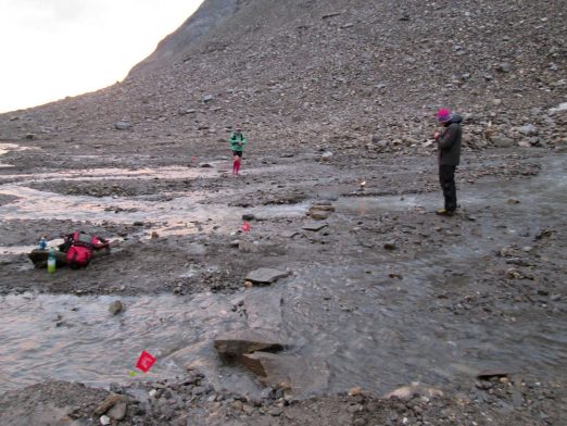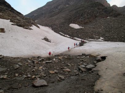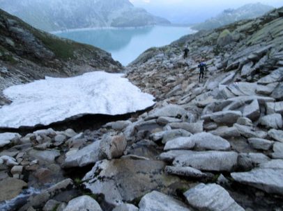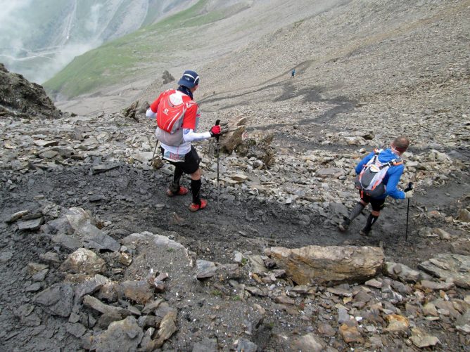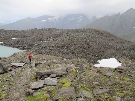 Das Gute nach einem schweren Anstieg ist der Abstieg. Denkste. Ein schwerer Abstieg ist ja noch bescheidener als ein schwerer Aufstieg. 25km bergab. Mit glühenden Beinen. Was ein Spaß. Nicht dass der Abstieg ab dem „Törl“ schwer war, es waren nur riesige Felsen über welche man sich einen Weg bahnen musste, nein, danach kamen von der Sonne angetaute Schneefelder, die es zu bestreiten galt. Von den vorangegangenen 110er- und 50er-Läufern waren Loipen ins Eis gefräst. Mehr auf dem Hintern als auf den Beinen ging es für mich hinab. Hinab durch zahllose Bäche die zu Flüssen wurden, durch den vielen Regen oder die schmelzenden Schneepassagen. Meine Füsse waren stets nass. Es war eine Mutprobe auch für meine Schuhe. Da ich keine Blasen habe, nicht fies stürzte und meine Füße sich gut anfühlen, denke ich dass die Roclite 290 auf der ersten und die Roclite 305 auf der 2ten Hälfte eine gute Wahl waren.