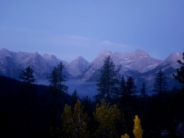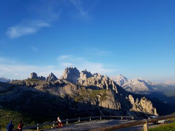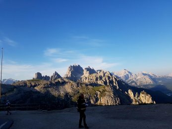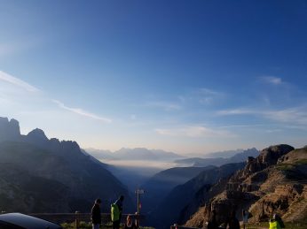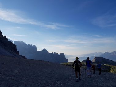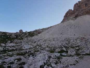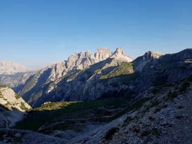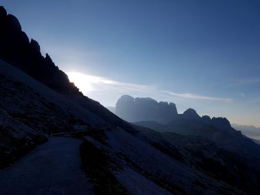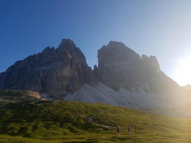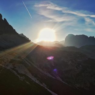 Beim Sonnenaufgang am Aufstieg zur Refugio Auronzo. Da war doch was? Dieser Bach, diese grüne Wiese?! Da war ich bei meiner 2ten Wanderung mit den Ju-Jutsus. Da lagen wir und chillten. Vor mehr als 10 Jahren (Update: 12 Jahre!). Genau auf dieser kleinen Wiese. Gänsehaut. Dann erinnerte ich mich dass wir damals dort von der Hütte abgestiegen sind. Selbst Aufsteigen fällt mir heute leichter 😀 … ein sehr schönes Déjà-vu. Weiter nach oben zur Hütte, Blick auf die 3 Zinnen, Wahrzeichen der Dolomiten. Wieder Gänsehaut. Was ein Start in den neuen Tag.