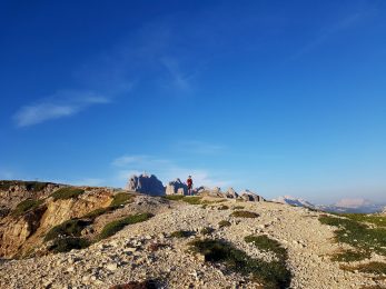 Die letzten KM zum Dropbag war trotz wenig Steigung Wandern angesagt. Nach einem ellenlangen steinigen Downhill waren die Beine platt. Und es war heiß. So kalt es in der Nacht war (Beinlinge, Langarmshirt & Windjacke), so heiß wurde es schon in den frühen Morgenstunden, locker über 30°C, oft kein Baum in Sicht um Schatten zu spenden. Aber hey, die Hälfte in der Tasche.