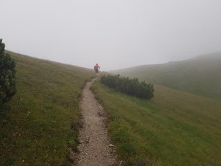 Krass schwere Wanderwege, Felslandschaften (die schon bei Tage alle gleich ausschauen), schlechte bis keine Markierungen, totale Müdigkeit, Monotonie, keine laufbaren Wege (zumindest für Menschen die schon mehr als 120km in den Beinen und Füssen haben. Das waren übrigens schon keine Blasen mehr unter den Füssen, die Dinger sahen nach der ersten Nacht im Regen aus wie Füße einer Wasserleiche. Sie rochen nicht nur nach Tod, sie sahen auch so aus. Bilder davon hab ich keine gemacht 🙂 … Na ja … Trittfest war man also auch nicht mehr wirklich.) Peitchender Wind, wehe Füße, man konnte fast nix mehr toppen. Doch, schon, denn der tapfere Philipp, mein steter Begleiter bei Nacht und ich, wir kamen uns vor wir Hänsel und Gretel im Wald. Nur gabs keine Brotkrumen und keine Hexe der wir aufs Maul hauen konnten. Ob wir wirklich Ehrenrunden gedreht haben sei zu vermuten, GPS war lange weg, die Aufzeichnung bei km 134 beendet. Wir mussten zum nächsten VP, koste es was es wolle. Hunger, Durst, Erfassung der Zeit. Also weiter. Immer wieder nach einem Hinweis suchend. Ein Zeichen, eine Fahne, Spuren von anderen Läufern. Man kam sich echt sehr hilflos vor. Immerhin waren wir zu zweit. Irgendwann gen Sonnenaufgang gings wieder ins Tal, nach einer Nacht über Stock und Stein. 8 Stunden oder so hats für 20 km gebraucht. Das war wirklich kein Spaß. Philipp hatte Probleme mit dem Knie, also war an einen schnellen Abstieg auch nicht mehr zu denken. Meine Füße brannten und immer wieder aufs neue nasse Füße machten es nicht angenehmer. Gegen 6 waren wir am nächsten VP. Gut im Eimer. Dann wieder mehr als 600 Meter steigen, über Kuhweiden und Trampelpfade gen Brixen. An Geschwindigkeit war nicht mehr zu denken, also einfach so ins Ziel trotteln. Zeit war egal, ankommen war alles. Ein letzter unnötiger (das braucht man nach 152 km einfach nicht mehr) Downhill, dann Zieleinlauf vorm Dom. 39:45h.