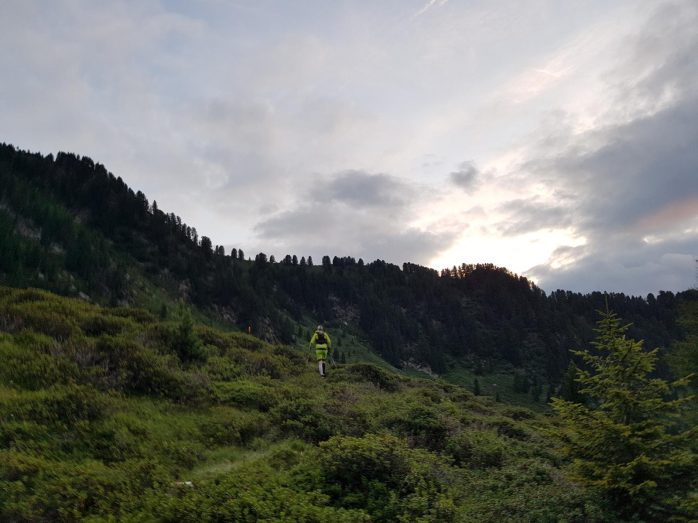 Die ersten ca 20 Stunden (ca 112 km) liefen gut. Die anvisierte Zielzeit von 32 Stunden war locker machbar. 12 Stunden für 48km … eigentlich kein Problem. Also schreibe ich nun nicht viel von den ersten Kilometern, der ersten kalten verregneten Nacht. Die ersten 20km gings fluffig mit leichtem Downhill aus Seefeld raus bis hin zum ersten Anstieg. Viele die Vollgas gaben sollte ich im Verlaufe des Rennens wieder sehen. Es gibt immer den ein oder anderen, der es einfach zu hart und zu schnell angeht. Bei einer solch langen Strecke ist eine gute Selbsteinschätzung, sowie die Einteilung der Kräfte das A und O: Also laufen lassen und im Idealfall einsammeln 😉 … Die erste Nacht lief also gut, morgens gegen acht, pünktlich zum Start der 100km-Läufer kamen wir in Steinach an. Also Umziehen bei der VP, essen und tanken und dann weiter. Ein ganzer heller Tag wartete auf uns. Bei zum Teil eisigen Winden auf den Bergkämmen kam kein Sommerfeeling auf. Selten lief ich ohne Windjacke. Meine immer wieder durch Matsch und Bäche nassen Füsse meckerten schon eine Weile. Augen zu und durch … 60km sind ja schon weg von der Uhr. Weiter durch den Tag, kämpfen um jeden Kilometer. Zwischendurch haben wir den ein oder anderen Hunderter getroffen, oder gar Gleichgesinnte 😉 … Schlafen war wollten wir nicht. Es war hell und der Wille war da. Also immer weiter bis hin zur nächsten VP, Gasteig. Depperter Radweg am Bach vorbei bis zur VP. Nun begann das eigentliche Rennen. Bis dato war alles „Kindergarten“. Vieles war laufbar und ließ sich einfach abspulen. Aber mit über 100 km auf dem Buckel, da begann nun die Herausforderung, der eigentliche Kampf.