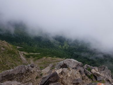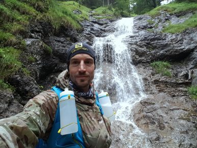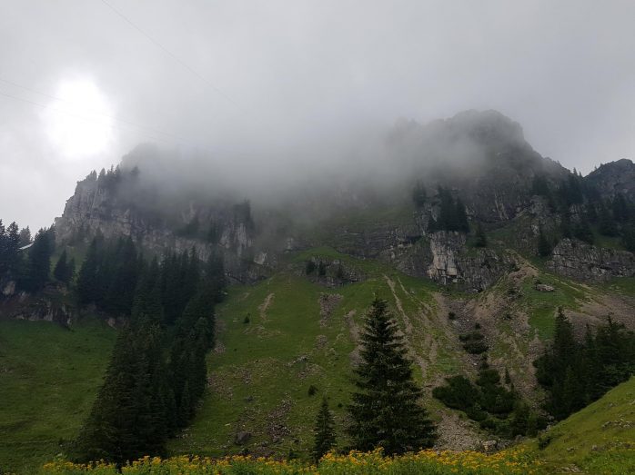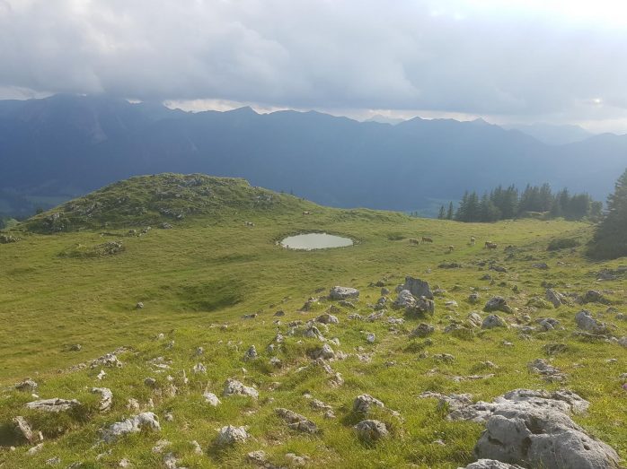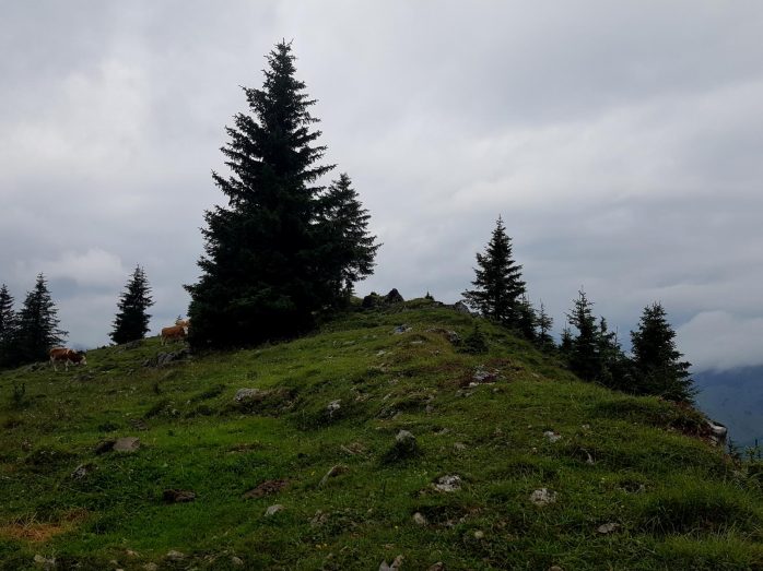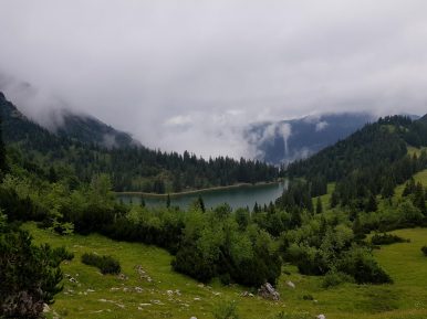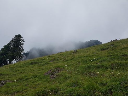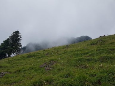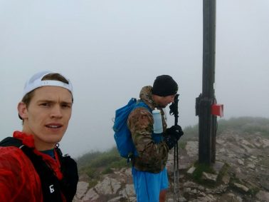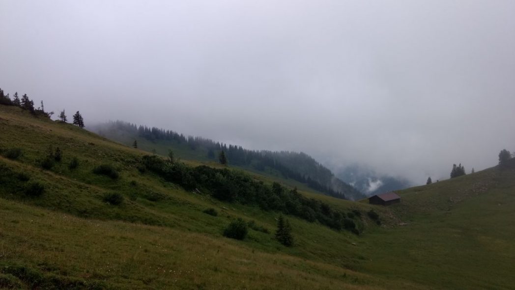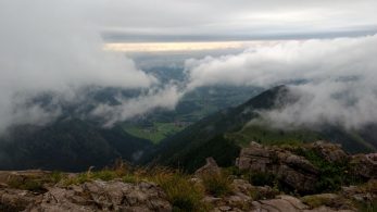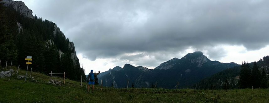 Regen weg, warm, bergauf, kalt, Wind, Jack an … usw. … hatte sogar Richtung Hochmiesing bei angekündigter Hagelschauer die Handschuhe ausgepackt. Weiter zur Rotwand haben wir (Tim und meiner einer) im Nebel den Abstieg nicht gefunden und sind erstmal übers Grat gewandert. Meine Fresse ^^ … erst als wir uns einig waren dass der Abstieg dort dann doch zu krass ist, sind wir wieder zurück und querfeldein zur Alm im Tal … aber zu zweit lässt man sich nicht entmutigen. Dann bei km ~22 Brotzeit 😀 …