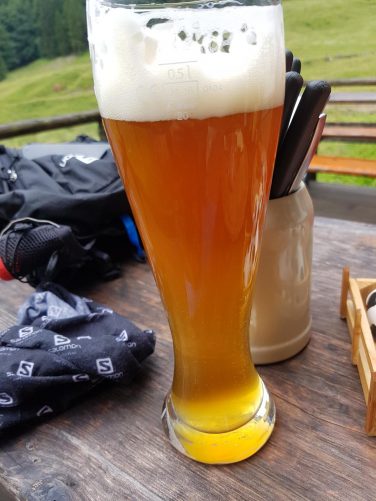 Nachdem dann noch eine wild gewordene Kuh uns verfolgte (kein Witz!) und Tim und ich im 100m Rekordtempo über die Wiese ballerten (das war der höchste Schnitt: zwischen 2:30 und 3:30 Min/km auf kurze Distanz in der hubbeligen Wiese), da mussten wir erst mal ein Beruhigungsweizen trinken! Puhhh … Harte Kanten, Gipfel, Grate, Abhänge überstanden … dann DNF wegen K.O. by Cow?! … verrückte Welt …