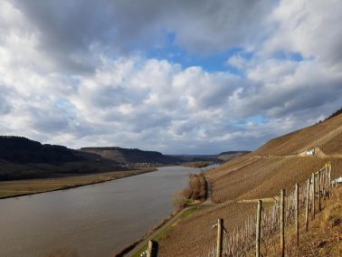 Die Strecke hat „nur“ 13 km und „nur“ ca. 550 Meter im reinen Anstieg, aber sie hat es wirklich in sich. Der Anstieg ist klettersteigähnlich und oft muss man das Stahlseil nutzen, um nicht auf allen Vieren hochzukraxeln. Ich bin in Mehring beim Sportplatz gestartet und gegen den Uhrzeigersinn gelaufen. Eine sehr gute Wahl finde ich. Nach einem kurzen Anstieg kann man sich gen Moselhöhe ausrollen lassen und die Gliedmaßen aufwärmen.